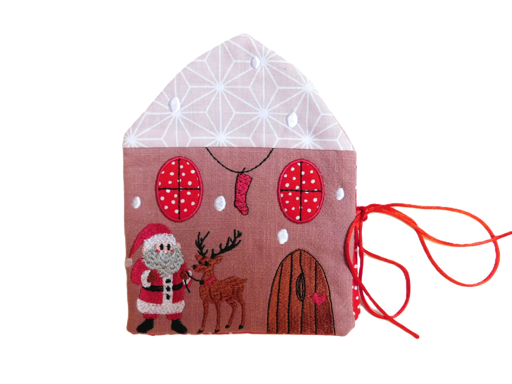 Haus vom Nikolaus - Stoffbuch zum aufklappen, wunderschön bestickt mit Nikolaus und seinem Rentier, einem Schlitten voller Geschenke und Strümpfe, die an